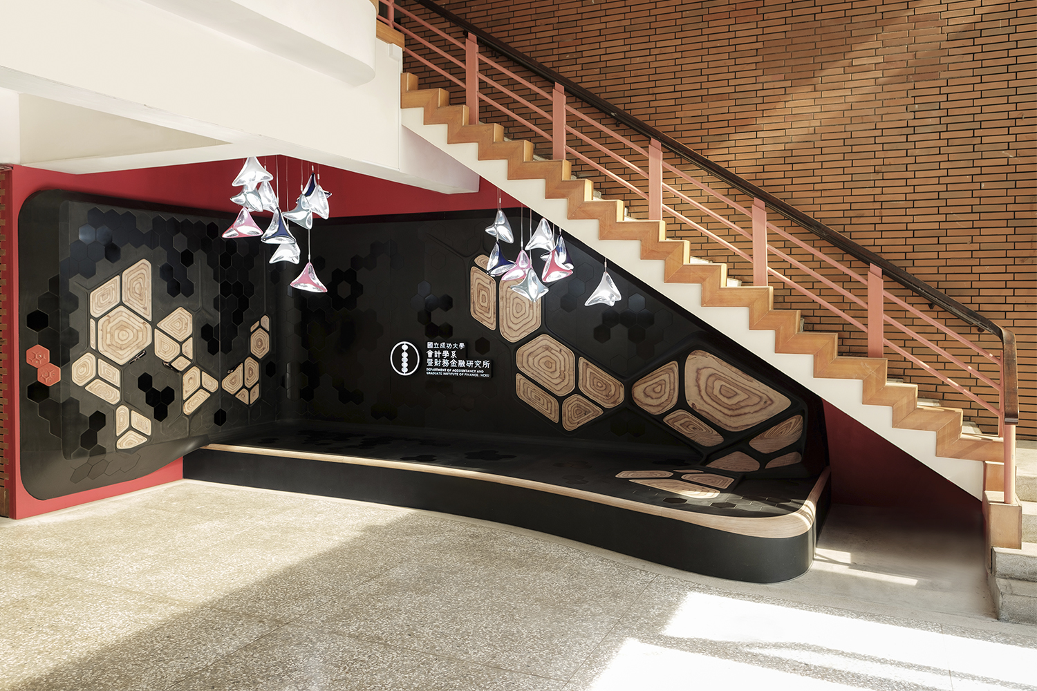 Challenged existing interior design conventions, this design evolved from the integration of material, fabrication, and computational logic. Hexapod design installation brings about a new and unique look and feel for the university space.